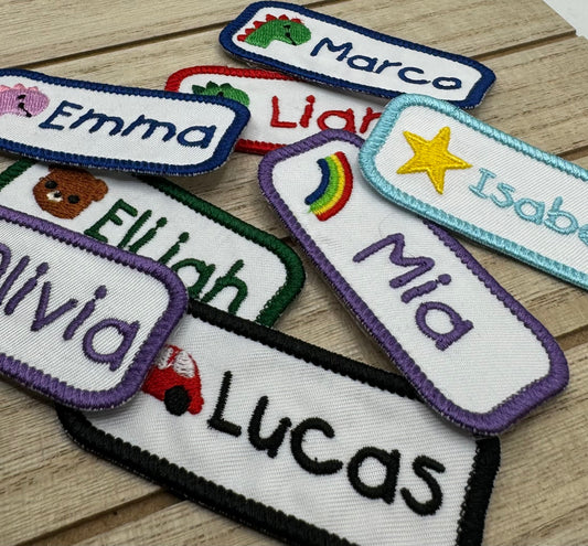 Custom Kids Name Tags Embroidered - 3.5 in x 1.2 in Iron-on, Sew-on Badges